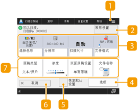 在<主页>屏幕上按<扫描后存储>,然后按<网络>或<存储介质>扫描原稿时,会显示以下设置屏幕。