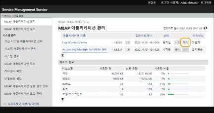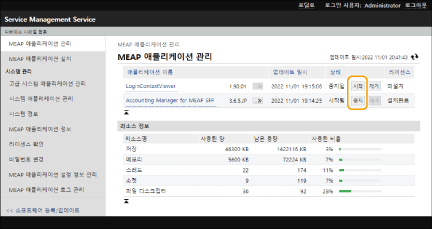 2 | 사용할 MEAP 응용 프로그램에 대해 [시작] / [중지]를 클릭하십시오. ![]() ![]() MEAP 응용 프로그램에 따라 기기를 다시 시작해야 하는 경우도 있습니다. 화면 안내에 따라 기기를 다시 시작하십시오. 메모리, 스레드, 소켓 또는 파일 기술자에 필요한 자원이 소진되면 [시작]을 클릭해도 응용 프로그램이 시작하지 않습니다. |