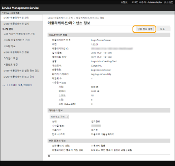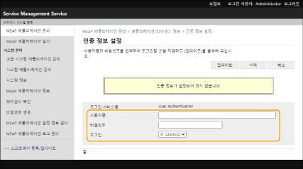 로그인 응용 프로그램이 변경되면 [MEAP 인증 정보 설정]에서 인증 정보를 재확인하십시오. 인증 정보를 다시 입력해야 할 수 있습니다. |