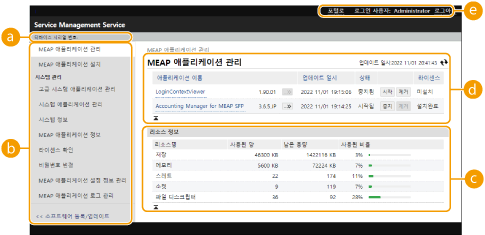 [MEAP 애플리케이션 설정 정보 관리] | MEAP 응용 프로그램 설정에 관련된 정보를 표시 또는 삭제합니다. 응용 프로그램 사이에 공유되는 설정 정보가 있을 경우, [애플리케이션의 공유 설정 정보]가 표시됩니다. 다른 항목과 같은 방법으로 삭제할 수 있습니다. |