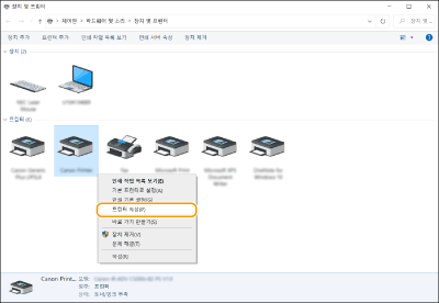 기기의 프린터 아이콘을 마우스 오른쪽 버튼으로 클릭하고 [프린터 속성]을 클릭합니다.