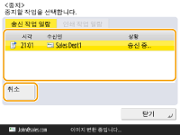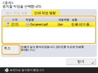 (중지)를 누르면, 진행 중인 전송/인쇄 작업이 일시 정지되고 <송신 작업 일람>/<인쇄 작업 일람>이 나타납니다.