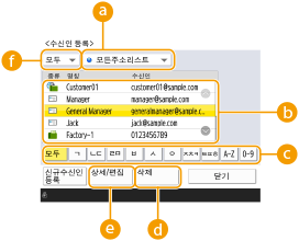 첫 글자 버튼수신인 이름의 첫 글자에 해당하는 영숫자 문자 버튼을 선택합니다. 등록된 모든 수신인을 표시하려면 <모두>를 누릅니다.
