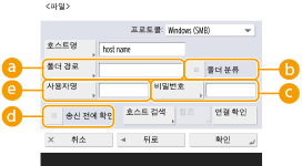 1 | 데이터를 전송하는 파일 서버/고급 박스의 호스트 이름을 입력합니다. ![]() 파일 서버/고급 박스에 대한 정보는 네트워크 관리자에게 문의하십시오. <프로토콜><Windows (SMB)>, <FTP> 및 <WebDAV>에서 파일 서버를 위한 프로토콜을 선택합니다. 문서를 고급 박스로 송신할 때 <Windows (SMB)> 또는 <WebDAV>를 선택합니다. ![]() <Windows (SMB)>를 선택하면, <호스트 검색> 및 <참조> 버튼이 표시됩니다. 네트워크를 검색하거나 확인하여 파일 서버/고급 박스를 쉽게 지정할 수 있습니다. <SMB 클라이언트 버전 지정>에서 <1.0>이 <설정>으로 설정된 경우 <참조>만 사용할 수 있습니다. <호스트명>파일 서버/고급 박스의 호스트 이름을 입력합니다. 프로토콜로 <FTP>를 선택한 경우 <호스트명>을 다음과 같이 입력하십시오. TLS가 비활성화되어 있는 경우 예: 공유 스페이스에 저장: ftp://<호스트명>/share 개인 스페이스에 저장: ftp://<호스트명>/users TLS가 활성화되어 있는 경우 예: 공유 스페이스에 저장: ftps://<호스트명>/share 개인 스페이스에 저장: ftps://<호스트명>/users 문서를 고급 박스로 송신할 때 다음과 같이 <호스트명>을 입력합니다. 프로토콜에 <Windows (SMB)>를 선택한 경우 예: 공유 공간에 저장: \\192.168.100.50\share 개인 공간에 저장: \\192.168.100.50\users 프로토콜로 <WebDAV>를 선택한 경우 <호스트명>을 다음과 같이 입력하십시오, <다음>을 누릅니다. TLS가 비활성화되어 있는 경우 예: 공유 공간에 저장: http://<IP 주소 또는 호스트 이름>/ 개인 공간에 저장: http://<IP 주소 또는 호스트 이름>/ TLS가 활성화되어 있는 경우 예: 공유 공간에 저장: https://<IP 주소 또는 호스트 이름>/ 개인 공간에 저장: https://<IP 주소 또는 호스트 이름>/ <연결 확인>파일 서버/고급 박스와의 연결을 확인하려면 호스트 이름을 입력한 후 이 버튼을 누릅니다. ![]() 개인 인증 관리 등의 로그인 서비스를 사용하는 경우 <사용자명>과 <비밀번호>를 입력해야 합니다. |