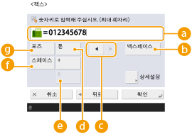 1 | 팩스 번호를 입력합니다. ![]() 팩스 번호 필드숫자 키를 사용하여 팩스 번호를 입력합니다. 필요한 경우에 부터 까지 입력합니다. <백스페이스> 팩스 번호 필드( )에서 커서 왼쪽에 있는 숫자를 하나씩 삭제합니다.![]() /![]() 팩스 번호 필드( )에서 커서를 왼쪽 또는 오른쪽으로 이동할 때 누르십시오. <톤>이 버튼을 누르면 "T"(톤)가 삽입됩니다. 펄스 다이얼을 사용하고 있더라도 톤 다이얼을 사용하여 "T" 다음의 숫자들이 전송됩니다. <R> 키기기가 PBX(Private Branch Exchange)에 연결된 경우 수신인을 입력하기 전에 이 버튼을 누릅니다. 이 버튼을 사용할 수 없는 경우 R키 설정을 등록해야 합니다. <R키 설정> <스페이스>읽기가 더 쉽게 숫자 사이에 빈 칸을 입력합니다. <포즈>이 버튼을 누르면 "P"(일시 정지)가 삽입됩니다. 해외로 팩스를 송신할 때 국제전화 식별 번호나 팩스 번호 뒤에 일시 정지를 삽입합니다. 이렇게 하면 연결 개선에 도움이 됩니다. ![]() 번호의 시작에 일시정지를 삽입할 수 있습니다. |
