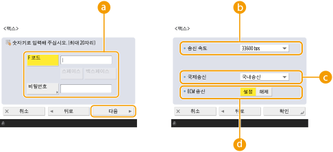 1 | 필요에 따라 설정을 지정합니다. ![]() <모드> (상황확인)을 누를 때 표시되는 전송 결과의 유형을 선택할 수 있습니다. I-팩스가 수신자의 기기로 전송되는지 확인하려는 경우 <가득>을 선택하거나, I-팩스가 메일 서버로 전송되는지 확인하려는 경우 <간단>을 선택합니다. 수신자의 기기가 <모드> 기능을 지원하지 않으면 전송 상태를 확인할 수 없습니다.![]() <가득> 모드를 사용하여 <가득> 모드를 지원하지 않는 기기로 I-팩스를 전송하는 경우, (상황확인)을 눌러 전송 상태를 확인하면 전송이 완료된 경우에도 <송신결과 대기...>가 표시됩니다. 이 상태는 <풀 모드 송신 타임아웃>에 설정된 시간이 경과할 때까지 계속 표시됩니다. (상황확인) <송신> <작업이력>을 눌러 전송 상태를 확인할 수 있습니다. 문서가 성공적으로 전송되면 <확인>이 표시되고, 문서 전송에 실패하면 <NG>가 표시되며, 결과를 확인할 수 없으면 <-->가 표시됩니다. 단순 모드에서는 전송 확인을 수행할 수 없기 때문에 전송에 성공하더라도 <-->가 표시됩니다. <서버경유>메일 서버를 통해 수신인에 대한 I-팩스 전송 여부를 지정합니다. 메일 서버를 통해 I-팩스를 전송하려면 <설정>을 선택합니다. 같은 근거리 통신망(LAN)의 수령인에게 직접 데이터를 전송하려면 <해제>를 누릅니다. 수령인에게 직접 전송함으로써 메일 서버에 부담을 주지 않고 대량 데이터를 발송할 수 있습니다. ![]() 메일 서버를 사용하지 않고 "user name@[the recipient's IP address]"와 같은 IP 주소 형식에 없는 I-팩스를 발송하려면 MX(Mail eXchange) 기록과 같은 설정이 DNS 서버에 구성되어야 합니다. 이런 종류의 설정이 사용 가능한지 네트워크 관리자에게 문의하십시오. <서버경유>에서 <해제>를 설정할 때는 <서버를 경유하여 송신을 사용>에서 <설정>을 미리 설정해야 합니다. 이 설정이 <해제>인 경우 <서버경유>의 설정을 변경할 수 없습니다. <서버를 경유하지 않고 MDN 허가>를 <설정>으로 설정하는 것이 좋습니다. <서버경유>를 <해제>로 설정하더라도 풀 모드를 사용하여 전송한 문서의 전송 정보가 서버를 통해 실행됩니다. <정형문 등록>이 설정은 인터넷 팩스 서비스를 사용하기 위해 필요합니다. 인터넷 팩스 서비스를 사용하지 않으면 이 설정이 필요없습니다. 자세한 내용은 인터넷 서비스 제공업체에 문의하십시오. <I-팩스 주소>adv01@example.com의 형식으로 I-팩스 주소를 입력합니다. 같은 네트워크의 수신인에게 전송할 때는 adv01@[192.168.11.100](수신인 장치 이름@[IP 주소])의 형식을 사용합니다. 사용할 도메인이 고정되어 있는 경우 도메인 항목을 생략할 수 있습니다. 도메인 이름을 <수신인으로 지정 도메인을 자동 추가>(으)로 등록하고 <I-팩스 수신인>을 미리 활성화하여 전송 시 "@" 및 도메인 이름을 추가할 필요 없이 도메인을 자동으로 추가할 수 있습니다. 키보드의 <등록 문자열>에 자주 사용하는 도메인 이름을 등록할 수 있으며 I-팩스 주소 입력 시 호출할 수 있습니다. <키보드의 등록 문자열> |