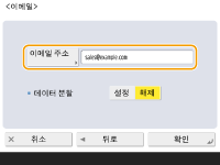 2 | <데이터 분할>에서 <설정> 또는 <해제>를 선택합니다. 전송 중인 데이터의 크기가 최대 한도를 초과하면 (<최대 송신 데이터 크기>), 데이터를 크기로 나눌 것인지 페이지로 나눌 것인지 선택합니다. <설정>을 선택하면 데이터는 한도를 초과하지 않는 작은 크기로 나뉘어 여러 부분으로 발송됩니다. 수령인의 이메일 소프트웨어는 수신된 데이터를 결합할 수 있어야 합니다. <해제>를 선택하면 한 번에 전송된 페이지 수가 감소하고 총 송신 내용은 여러 부분으로 나뉩니다. 예를 들어 10페이지의 데이터가 한 번에 5페이지씩 두 번 발송됩니다. 그러므로 상대방은 두 개의 이메일을 받습니다. 그러나 JPEG와 같이 페이지로 나눌 수 없는 데이터를 발송하면 송신 에러가 발생합니다. ![]() 사용할 도메인이 고정되어 있는 경우 도메인 항목을 생략할 수 있습니다. 도메인 이름을 <수신인으로 지정 도메인을 자동 추가>(으)로 등록하고 <이메일 수신인>을 미리 활성화하여 전송 시 "@" 및 도메인 이름을 추가할 필요 없이 도메인을 자동으로 추가할 수 있습니다. 키보드의 <등록 문자열>에 자주 사용하는 도메인 이름을 등록할 수 있으며 이메일 주소 입력 시 호출할 수 있습니다. <키보드의 등록 문자열> |
