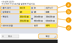 2 | 각 설정을 지정하기 위해 <수신지 조건> 을 누른 뒤 <확인>을 누릅니다.![]() <용지 크기>수신인이 수신할 수 있는 용지 크기를 설정합니다. 전송할 데이터의 용지 크기가 수신인 장치의 사양과 일치하는지 확인한 다음 이 설정을 지정합니다. <A4/LTR>: A4/LTR 크기로 전송합니다. <A4/LTR> + <B4>: A4/LTR 크기 또는 B4 크기로 전송합니다. <A4/LTR> + <A3/11x17>: A4/LTR 크기 또는 A3/11" x 17" 크기로 전송합니다. <A4/LTR> + <B4> + <A3/11x17>: A4/LTR 크기, B4 크기, 또는 A3/11" x 17" 크기로 전송합니다. ![]() 스캔한 데이터의 용지 크기가 <용지 크기>에 설정된 크기보다 작을 경우 데이터가 <용지 크기>에 설정되고 빈 여백이 있는 최소 용지 크기로 전송됩니다. 스캔한 데이터의 용지 크기가 <용지 크기>에 설정된 크기보다 작을 경우 데이터가 축소되어 <용지 크기>에 설정된 최대 용지 크기로 전송됩니다. 수신인의 기기 사양에 따라 수신인의 조건을 설정합니다. 전송할 데이터의 용지 크기가 수신인의 장치와 함께 사용할 수 있는 용지 크기보다 큰 경우 이미지가 잘릴 수 있습니다. <압축방식>압축 방법을 선택합니다. 압축비는 MMR, MR, MH 순으로 높습니다. 압축비가 높을수록 전송 시간이 짧아집니다. <해상도>해상도 및 이미지 품질 향상을 위해 높은 값을 선택합니다. 그러나 해상도가 높으면 필요한 전송 시간이 길어집니다. <데이터 분할>전송 중인 데이터의 크기가 최대 한도를 초과하면 (<최대 송신 데이터 크기>), 데이터를 크기로 나눌 것인지 페이지로 나눌 것인지 선택합니다. <설정>을 선택하면 한도를 초과하지 않는 작은 크기로 나뉘어 여러 부분으로 발송됩니다. 수령인의 이메일 소프트웨어는 수신된 데이터를 결합할 수 있어야 합니다. I-팩스 설정 구성을 위해 1단계에서 <서버경유>의 <해제>를 선택하면 최대 한도를 초과하더라도 데이터는 나누어지지 않고 전송됩니다. ![]() 수령인의 기기 사양에 따라 수신인의 조건을 설정합니다. 수령인의 기기가 지원하지 않는 조건을 설정하는 경우 전송 에러가 발생할 수 있습니다. |