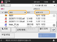 목록에 여러 작업/파일이 있다면 <명칭> 또는 <날짜/시각>을 눌러서 항목의 목록을 정렬할 수 있습니다.