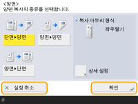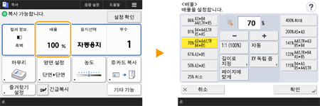 복사 비율, 복사 용지, 복사 부수 등의 설정 상태가 표시됩니다. 설정을 변경하려면 원하는 설정 항목을 선택합니다.