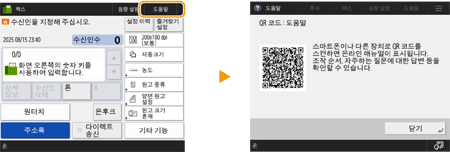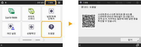 <도움말>을 누르면 QR 코드가 표시됩니다. 스마트폰이나 태블릿과 같은 모바일 장치로 이 QR 코드를 스캔하면 이 기기의 사용자 안내서 페이지에 액세스할 수 있습니다.