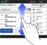 스마트폰과 같은 방법으로 작동(넘기기/끌어서 놓기)일부 화면에서는 스마트폰을 사용할 때처럼 손가락으로 화면에서 위/아래 혹은 왼쪽/오른쪽으로 넘기며 페이지를 전환하거나 스크롤할 수 있습니다. <화면색 반전>을 <설정>으로 설정한 경우 넘기기 작동과 끌어서 놓기 작동을 사용할 수 없습니다. <화면색 반전>이동 가능한 버튼이 있는 화면의 경우 버튼을 끌어서 놓아 이동할 수 있습니다. 목록을 넘어가는 넘기기 및 스크롤일부 화면에서는 목록 바깥쪽으로 넘겨도 목록이 스크롤됩니다. |