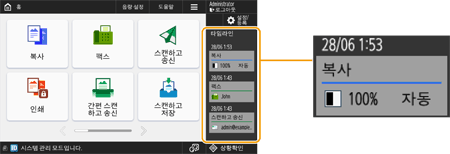 <작업 리스트의 표시 설정>에서 <개인>을 <해제>로 설정하면 주의 사항이 타임라인에 표시되지 않습니다. <인증 사용자 이외의 작업 표시>를 <설정>으로 설정하면, 로그인한 사용자의 인쇄되지 않은 작업 및 다른 사용자의 인쇄되지 않은 작업 총 수가 주의 사항에 표시됩니다. |