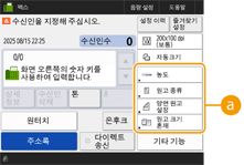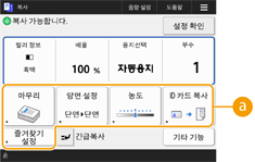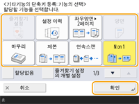 기본 특징 화면에 있는 설정 항목의 수와 표시될 위치는 기능에 따라 달라집니다. <할당없음>을 단축키로 설정하면 단축키 버튼이 표시되지 않습니다. 등록할 수 있는 <기타 기능>에 대한 단축키의 수는 다음과 같이 제한됩니다. 복사: 5 팩스: 4 스캔 및 전송: 2 |
