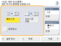 양면 원고로 소책자 복사를 수행하는 경우, <양면원고>을 누르고 필요에 따라 <좌우열기> 또는 <상하열기>를 선택하십시오.