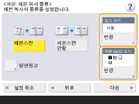 <원고 크기>에서 <변경>을 누르고 원고 크기를 선택하십시오. <자동>을 선택하면 소책자 크기가 원고 크기에 따라 자동으로 선택됩니다.