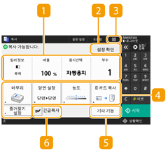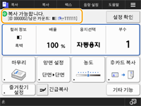 복사 비율, 용지 크기 및 복사 부수 등 설정 상태를 표시합니다. 제대로 복사하려면 설정을 꼭 확인해야 합니다. 설정을 변경하려면 원하는 설정 항목을 선택합니다.