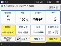 일부 기능은 함께 조합하여 사용할 수 없습니다. 선택할 수 없는 버튼은 연한 회색으로 표시됩니다. 복사 부수와 설정에 따라 <시험 복사>가 표시되어 샘플 복사본을 인쇄함으로써 복사 결과를 확인할 수 있습니다. 복사 결과 확인부서 ID 관리로 페이지 제한을 설정한 경우 남은 페이지 수가 표시됩니다. 부서 ID 관리 및 페이지 제한에 대한 정보는 부서 ID 관리 설정 구성을 참조하십시오. |