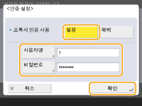 <인증 설정>프록시 서버 인증 기능을 사용하려면 이 항목을 선택하여 인증 정보를 구성합니다. 표시된 화면에서 <설정>을 누르고 프록시 인증에 사용할 사용자 이름과 비밀번호를 입력한 후, <확인>을 누릅니다.
