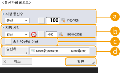 이메일로 전송된 문서의 경우 목록은 기기와 수신인 간이 아니라 기기와 메일 서버 간의 전송 결과를 나타냅니다. 3단계에서 <건수 지정 출력>을 선택하면 목록에 나타나는 로그 결과의 수를 지정할 수 있습니다. 목록의 자동 인쇄 여부를 지정할 수 있습니다. |