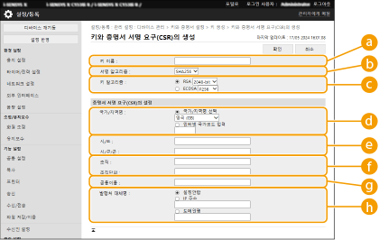 기기에 키와 CSR을 생성할 수 있습니다. CSR 데이터를 화면에 표시하거나 이를 파일로 내보내기 하는 것도 가능합니다.