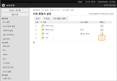 CSR을 생성한 키가 키 및 인증서 목록 화면에 표시되지만, 단독으로는 사용할 수 없습니다. 이 키를 사용하려면, CSR을 바탕으로 하여 이후에 발행된 인증서를 등록해야 합니다. 키에 인증서 등록 |