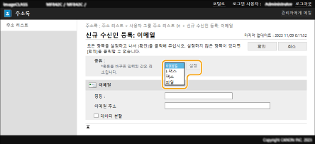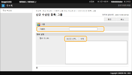 1 | 수신인을 등록할 주소 목록을 클릭합니다([개인 주소 리스트], 사용자 그룹 주소 목록, [주소 리스트 01] ~ [주소 리스트 10] 또는 [관리자용 주소 리스트]). [개인 주소 리스트]는 로그인한 사용자만 사용할 수 있으며 개인 인증 관리가 활성화 됐을 때만 사용이 가능합니다. [관리자용 주소 리스트]는 관리자 또는 장치 관리자 권한으로 로그인한 사용자만 사용할 수 있습니다. PIN 입력 페이지가 표시되면 PIN 입력 후 [확인]을 클릭합니다. 등록된 사용자 그룹과 수신인을 공유하려면 등록된 사용자 그룹 주소 목록을 선택합니다. ![]() 또한 관리자 권한이 있는 사용자만 리모트 UI에서 수신인을 등록/편집할 수 있도록 허용하여 사용자 그룹 주소 목록을 관리할 수 있습니다. <사용자 그룹 주소 리스트를 사용> |