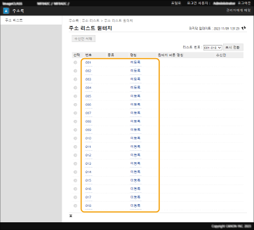 1 | 수신인을 등록할 주소 목록을 클릭합니다([사용자 그룹 주소 목록 01] 부터 [사용자 그룹 주소 목록 50]). |