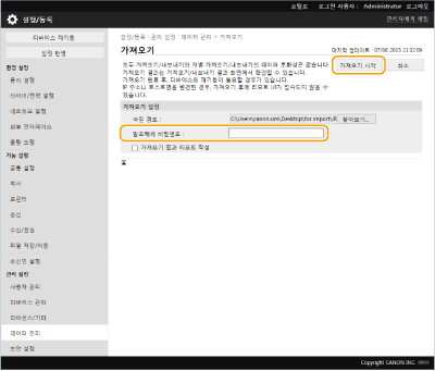 내보내기 한 설정 데이터를 가져오기할 때 [암호화 비밀번호]에 입력한 비밀번호를 입력해야 합니다. 영숫자 문자를 사용하십시오.