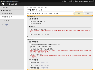 보안 정책이 구성되어 있는 경우, 조작 패널 또는 리모트 UI에서 <설정/등록> 화면이 표시될 때 기능 및 작동이 제한되었음을 알리는 메시지가 표시됩니다.