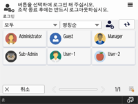 | | 이 방법을 사용하면 사용자 이름을 입력할 필요 없이, 제어판에 표시된 사용자 이름을 눌러 로그인 할 수 있습니다. 이 방법은 사용자가 로컬 디바이스에 등록된 경우에만 사용이 가능합니다. 무단 로그인을 방지하려면 사용자가 PIN 또는 패턴을 입력해야 할 수도 있습니다. 사용자 정보는 수동 및 자동으로 등록할 수 있습니다( 사용자 로그인 방법 및 인증 장치 구성). |
