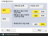 기기에 등록된 사용자에 대해 부서 ID가 설정되어 있는지 확인합니다. 로컬 장치에 사용자 정보 등록 부서 ID 관리자는 로컬 장치에 등록되어 있는 사용자에 대해 항상 유효합니다. 관리자 권한이 있는 사용자로 로그인하는 경우 시스템 관리자 ID와 PIN이 자동으로 할당되고 부서 ID로 관리됩니다. |