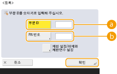 3 | 부서 ID와 PIN을 입력하고 <확인>을 누릅니다. ![]() <부문 ID>부서 ID로 최대 7자리의 숫자를 입력합니다. <PIN 번호>PIN으로 최대 7자리 숫자를 입력하고 <확인입력>을 누릅니다. 확인을 위해 PIN을 다시 입력하고 <확인>을 누릅니다. PIN을 설정하지 않으려면, 이 항목을 빈 칸으로 둡니다. ![]() 예를 들어 "00" 또는 "0000000"과 같이 0으로만 구성된 부서 ID 또는 PIN을 등록할 수 없습니다. 7자리 미만을 입력하더라도 숫자 앞에 0이 추가되어 7자리 숫자가 설정됩니다. <제한 설정/해제와 제한면수 설정>을 눌러 부서가 복사, 스캔, 인쇄할 수 있는 최대 페이지 수를 설정할 수 있습니다. 또한 부서 ID 및 PIN의 요구 사항으로 7자리를 입력할 수 있습니다. 자세한 내용은 대리점이나 서비스 담당자에게 문의하십시오. |