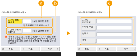 시스템 관리자 설정에 필요한 변경사항을 입력한 후 <확인>을(를) 누릅니다.