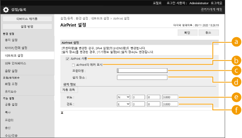 기기 이름 및 설치 위치를 포함하여 기기 식별에 사용되는 정보를 등록할 수 있습니다. AirPrint 사용에 필요한 설정을 리모트 UI를 사용하여 원격으로 구성할 수 있습니다.