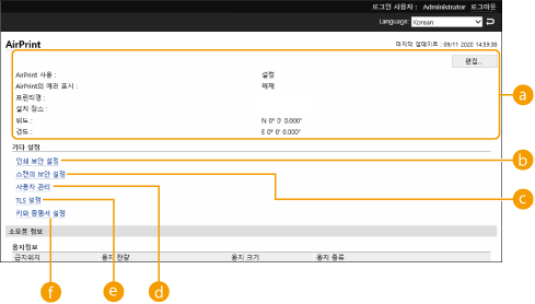 관리자 권한으로 로그인하면 AirPrint 페이지에서 AirPrint 설정을 변경할 수도 있습니다.