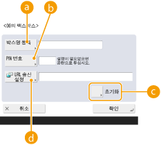 5 | 편지함 번호를 선택하고 각 설정을 지정한 후 <확인>을 누릅니다.![]() <박스명 등록>편지함의 이름을 등록합니다. <PIN 번호>편지함의 PIN을 입력합니다. <초기화>편지함을 초기화합니다. <URL 송신 설정>문서가 저장되어 있는 편지함의 URL을 이메일을 통해 전송하거나 리모트 UI 화면에서 확인할 수 있습니다.