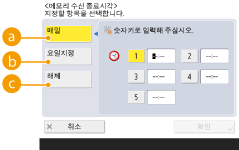 4 | <메모리 수신 종료시각>을 누르고 필요한 설정을 지정합니다. ![]() <매일>메모리 수신을 종료하는 시간을 설정합니다. <요일지정>메모리 수신이 종료되는 요일과 시간을 설정합니다. <해제>메모리 수신 종료 시간을 설정하고 싶지 않을 때 선택합니다.