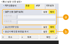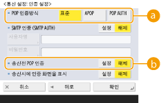1 | 각 항목을 지정합니다. ![]() <POP 인증방식>POP3 서버의 인증 방법을 설정합니다. 인증하는 동안 비밀번호를 암호화하려면 <APOP>를 선택합니다. 메일을 수신할 때 사용자를 인증하려면(POP) <POP AUTH>를 선택합니다. <송신전 POP 인증>POP3서버를 사용하여 인증을 수행하려면 <설정>을 누릅니다. |