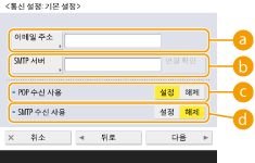 <통신 설정>을 누릅니다.1 | 기본 설정을 지정합니다. ![]() <이메일 주소>기기의 이메일 주소를 입력합니다. 어떤 이름이든 사용자 이름으로 지정할 수 있습니다(@ 부호의 왼쪽 부분). @ 부호의 오른쪽에 등록된 호스트 이름을 입력합니다. <SMTP 서버>SMTP 서버 이름(또는 IP 주소)을 입력합니다. 설정을 지정한 후 <SMTP>의 연결을 확인합니다. ![]() 리모트 UI의 [SMTP 인증함 (SMTP AUTH)]에 [비밀번호]가 지정된 경우 [SMTP 서버]에서 서버 주소를 변경하고 등록하려면 [SMTP 인증함 (SMTP AUTH)]의 [비밀번호]에 비밀번호를 입력해야 합니다. <POP 수신 사용>POP3 서버를 사용하여 이메일 및 I-팩스를 받으려면 <설정>을 누릅니다. <SMTP 수신 사용>기기 SMTP 서버가 이메일 및 I-팩스를 수신하게 하려면 <설정>을 누릅니다. DNS 서버 기기의 호스트 이름을 등록하지 않으면 SMTP를 통해 수신할 수 없습니다. |