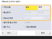 3 | 이더넷 유형을 선택합니다. <10BASE-T>, <100BASE-TX> 혹은 <Ethernet 종류>의 <1000BASE-T>을 선택합니다. |