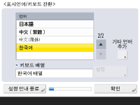 화면에 표시될 언어를 선택하십시오. 문자를 입력하기 위해 표시되는 키보드 배열을 언어에 따라 바꿀 수 있습니다. ![]() ![]() 언어를 선택하고 <확인>을 누르십시오. 키보드 배열을 바꾸려면 <설정>을 누르고 키보드 배열을 선택한 후<확인>을 누르십시오. 언어 교환 버튼을 표시하면 언어를 자주 교환하는 경우 편리합니다. 표시언어 전환 | |