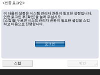 관리자 권한을 요구하는 설정을 구성하려면 인증 로그인을 하십시오. ![]() ![]() <로그인>을 누르고, 관리자 권한이 있는 사용자를 선택한 다음, 조작 패널의 숫자 키를 사용하여 비밀번호를 입력합니다. “관리자”에 대한 기본 비밀번호는 “7654321”입니다. <로그인>을 다시 누른 다음, <확인>을 누릅니다. 출고 시 기본 비밀번호를 입력하면 비밀번호 변경을 요구하는 화면이 표시됩니다. 비밀번호는 나중에 변경할 수 있습니다. 관리자로 로그인 관리자 권한을 요구하는 설정을 건너뛰고 <스킵>를 눌러 다음 단계로 갈 수 있습니다. 이 경우에 10단계로 가십시오. | |