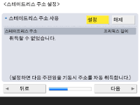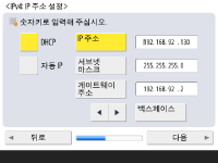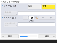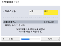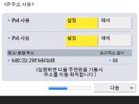 네트워크 연결 설정을 지정합니다. ![]() ![]() <IPv4 사용> 혹은 <IPv6 사용>을 위해 <설정>을 누른 후 <다음 단계로>를 누릅니다. IPv4와 Pv6을 모두 사용할 수 있습니다. <IPv4 사용> 및 <IPv6 사용>을 <해제>로 누르고, <확인>을 누를 경우, 네트워크 설정을 건너뛰고 9단계로 갑니다. ![]() <IPv4 사용>을 위해 <설정>누르는 경우 다음 설정을 지정하십시오. ![]() IP 주소를 자동으로 획득하려면, <DHCP> 혹은 <자동 IP>를 누른 후 <다음 단계로> 또는 <확인>을 누르십시오. IP 주소를 수동으로 설정하려면 <DHCP> 또는 <자동 IP>에 대한 선택을 해제하고, <IP주소>, <서브넷 마스크> 및 <게이트웨이 주소>를 눌러 각 값을 입력한 후 <다음 단계로> 또는 <확인>을 누릅니다. IPV4 주소 설정에 대한 정보는 IPv4 주소 설정을 참조하십시오. ![]() <IPv6 사용>을 위해 <설정>누르는 경우 다음 설정을 지정하십시오. ![]() 스테이트리스 주소를 사용하려면 <설정>을 누르거나 스테이트리스 주소를 사용하지 않으려면 <해제>를 누른 후, <다음 단계로>를 누릅니다. IPv6 주소에 대한 정보는 IPv6 주소 설정을 참조하십시오. ![]() 스테이트리스 주소를 지정한 후 다음 설정을 지정합니다. ![]() 수동 주소를 사용하려면 <설정>을 누르거나 수동 주소를 사용하지 않으려면 <해제>를 누른 후, <다음 단계로>를 누릅니다. 수동 주소를 사용하려면 <수동 주소>, <프리픽스 길이>를 누른 뒤 <기본 라우터 주소>를 눌러 각 값을 입력합니다. ![]() 수동 주소를 지정한 후 다음 설정을 지정합니다. ![]() DHCPv6를 사용하려면 <설정>을 누르거나 DHCPv6를 사용하지 않으려면 <해제>를 누른 후, <확인>을 누릅니다. | |