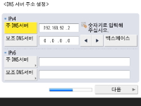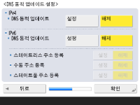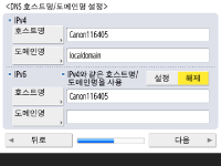 DNS 서버 주소, DNS 호스트 이름, DNS 도메인 이름을 지정합니다. ![]() ![]() <주 DNS서버>와 <보조 DNS서버>를 누르고, DNS 서버에 대한 IPV4/IPv6 주소를 입력한 후 <다음 단계로>를 누릅니다. DNS서버 주소 설정에 대한 정보는 DNS 설정 구성을 참조하십시오. ![]() ![]() 기기 이름(호스트 이름)을 입력하려면 <호스트명>을 누릅니다. <도메인명>을 눌러 기기가 속한 도메인 이름을 입력한 후, <다음 단계로>를 누릅니다. IPv4 및 IPv6 설정이 같은 경우, <IPv4와 같은 호스트명/도메인명을 사용>을 위해 <설정>을 누릅니다. ![]() ![]() DNS 동적 업데이트 설정을 사용하여 자동으로 업데이트하려면 <DNS 동적 업데이트>를 위해 <설정>을 누른 후, <확인>을 누릅니다. <IPv6>를 위한 <DNS 동적 업데이트>를 <설정>에 설정하려면, 자동으로 등록할 항목을 위해 <설정>을 선택하십시오. | |