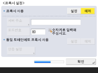 프록시를 사용하기 위한 필수 설정을 지정합니다. ![]() ![]() 프록시를 사용하려면 <설정>을 누르고, <서버주소> 와 <포트번호>를 눌러 각 값을 입력한 후, <확인>을 누릅니다. <동일 도메인에도 프록시 사용>을 <설정>에 설정한 경우, <인증 설정>을 눌러 프록시 인증 설정을 지정합니다. 프록시 설정에 대한 정보는 프록시 설정을 참조하십시오. | |