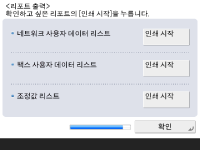 네트워크 사용자 리스트, 팩스 사용자 데이터 리스트 및 조정값 리스트를 인쇄할 수 있습니다. ![]() ![]() 인쇄하려는 리포트에 대해 <인쇄 시작>을 누릅니다. 인쇄가 완료되거나 리스트를 인쇄하지 않는 경우 <확인>을 누릅니다. | |