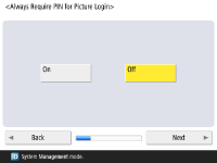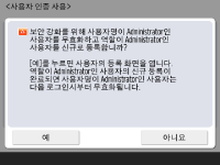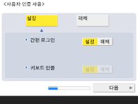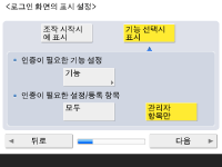 기기 보안을 강화하려면 사용자 인증을 사용하는 시스템에서 기기를 사용합니다. ![]() 이 기기는 사용자 인증을 로그인 서비스로 사용하는 것으로 설정되어 있습니다. 자세한 내용은 개인 인증 관리 설정 구성를 참조하십시오. ![]() <사용자 인증 사용>을 <설정>으로 누르고, 사용할 로그인 방법으로 <설정>을 누른 다음, <다음 단계로>를 누릅니다. 사용자 인증을 사용하지 않는다면, <사용자 인증 사용>을 위해 <해제>를 누르고 <확인>을 누른 후 5단계로 가십시오. ![]() 기기에 등록된 "관리자" 사용자 외에 관리자가 없는 경우 다음 설정을 지정합니다. ![]() “관리자” 사용자를 비활성화하고 새로운 관리자를 등록하여 보안을 강화하려면 <예>를 누릅니다. <관리자 등록>에 <사용자명>과 <비밀번호>를 입력하고 <확인>을 누릅니다. 필요에 따라 <이메일 주소>, <부문 ID>, <표시명>을 지정합니다. 자세한 내용은 로컬 장치에 사용자 정보 등록를 참조하십시오. 다음에 로그인하면 “관리자” 사용자가 비활성화됩니다. "관리자"로 작동하려면 <아니요>를 누릅니다. ![]() ![]() 로그인 화면 표시 타이밍을 선택합니다. <기능 선택시 표시>를 선택한 경우 <기능>을 누르고 로그인 화면을 표시할 기능을 선택한 뒤 <양호>을 누릅니다. 또한 로그인 화면을 표시할 <설정/등록> 화면에서 설정 항목을 선택합니다. <간편 로그인> 및 <키보드 인증>에 <해제>를 선택한 경우 <확인>을 누릅니다. 5단계를 진행합니다. <간편 로그인> 또는 <키보드 인증>에 <설정>을 선택한 경우 <다음>을 누릅니다. ![]() ![]() 로그인 화면에서만 숫자키 입력을 통해 인증을 사용하려면 <설정>을 누릅니다. <간편 로그인>에 <해제>를 선택한 경우 <확인>을 누릅니다. 5단계를 진행합니다. <간편 로그인>에 <설정>을 선택한 경우 <다음>을 누릅니다. ![]() ![]() 화상 로그인 시 사용자에게 PIN 또는 패턴 입력을 요구할지 여부를 설정한 후 <다음>을 누릅니다. ![]() ![]() 기기가 인쇄 기능에 적절한 상태에서 그림 로그인을 사용하려면 <설정>을 누릅니다. 이 설정으로 인쇄 강제 보류 기능 사용, 사용자 등록을 위해 컴퓨터로부터 전송된 인쇄 데이터 활용, 사용자가 인쇄를 위해 기기를 동작할 때 각 개인 사용자에 적절한 로그인 화면을 기본으로 표시가 가능합니다. 자세한 내용은 인쇄 강제 보류 설정 구성하기, <사용자 등록 방법>, <간편 로그인 화면의 기본 표시 변경>을(를) 참조하십시오. ![]() ![]() 그림 로그인 화면의 사전 설정 버튼의 수를 선택하고 <확인>를 누릅니다. | |