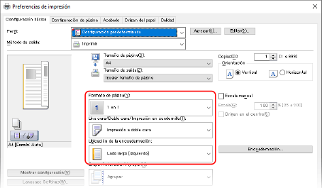 Durante la comprobación de la vista preliminar de impresión, establezca [Formato de página]  [Orden de páginas]  [Una cara/Doble cara/Impresión en cuadernillo]  [Ubicación de la encuadernación].