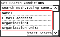 5 | Press [Start Search]. The users who meet the search conditions are displayed. When the authentication screen is displayed, enter the user name and password of the machine that is registered to the LDAP server, and press [Apply]. |